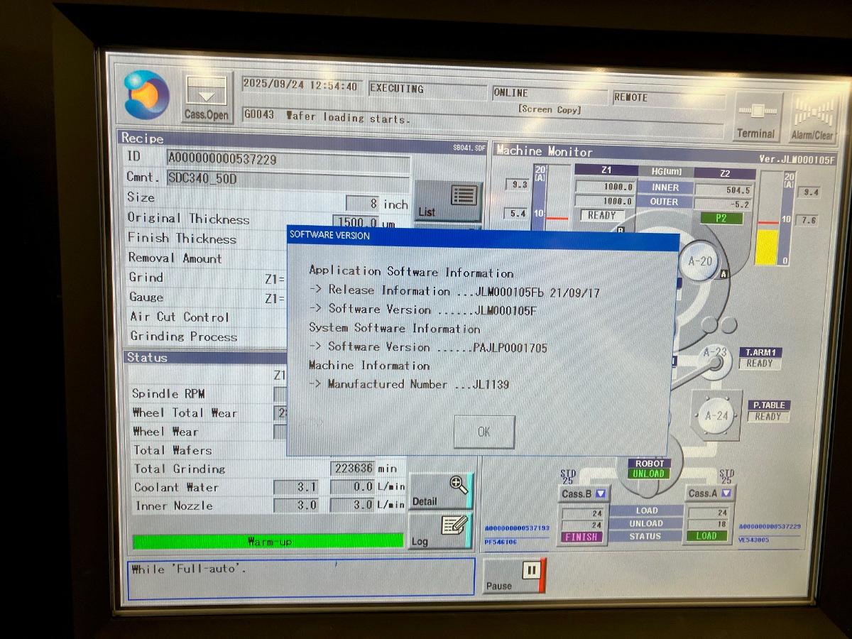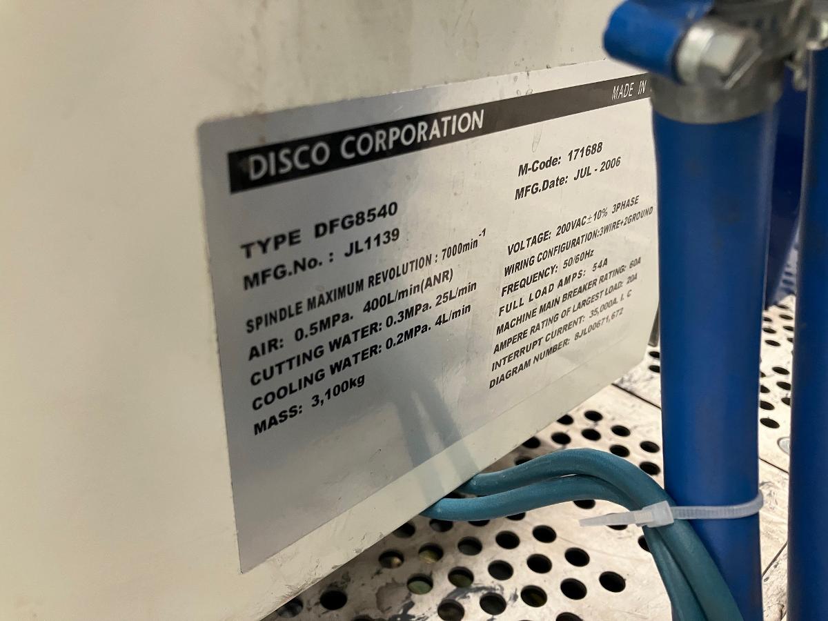 Item ID: 262290 1 Offered at Best Price Disco 15 DFG850 DFG 8540 Grinding Tool ... other images Unit Price Unstated Number of Units 1 Manufacturer Disco Model DISCO 15 DTU 152 Spindle Type Air Bearings Maximum Spindle Speed Max 70,000 RPM External Cooling Water Cooled Condition Good Year of Manufacture 2006 Power Requirements 200-208 V 50/60 Hz 3 Phase Serial Number(s)118DC073 Shipping & Handling:All items are sold on condition `as is and where is`. Ex work from current location excluding de-installation, de-hook up, discharge, packaging, crating and delivery. We are not responsible for any damage incurred during shipment. Payment:100% downpayment Make OFFERSend QUESTIONS